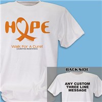 This Personalized Awareness T-Shirt is available on our 100% cotton t-shirts. Machine washable in youth sizes XS-L and adult sizes S-3XL. FREE Personalization is included on the back of each Shirt. Personalize the back of your Leukemia Walk Shirts with any three line custom message.